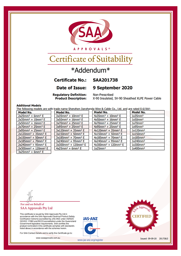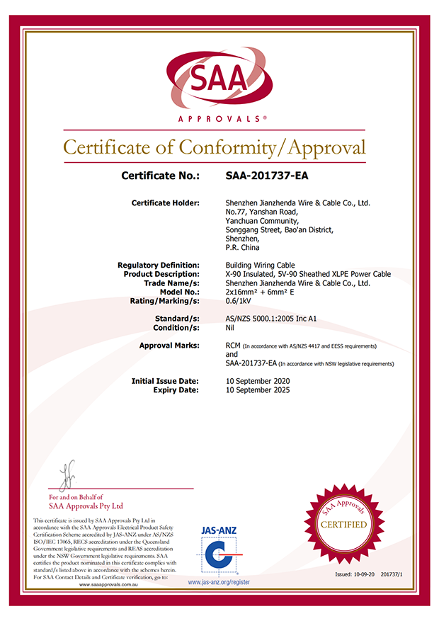深圳建圳達(dá)電線(xiàn)電纜有限公司,成立于2000年,是一家電線(xiàn)電纜制造商,我們通過(guò)了世界各地不同市場(chǎng)的多數(shù)認(rèn)證,如:CCC、RoHS、CB、SAA、TUV、VDE、PSE、BPS、UL、CSA。我們根據(jù)定制產(chǎn)品不斷更新新的認(rèn)證。經(jīng)過(guò)數(shù)十年的發(fā)展,我們與來(lái)自世界各地的客戶(hù)建立了長(zhǎng)期的合作關(guān)系。我們?cè)?jīng)是菲律賓機(jī)場(chǎng),,柬埔寨的電力站,美國(guó)的醫(yī)院,工廠,埃塞俄比亞的水電站項(xiàng)目。我們是一家值得信賴(lài)的電線(xiàn)供應(yīng)商。